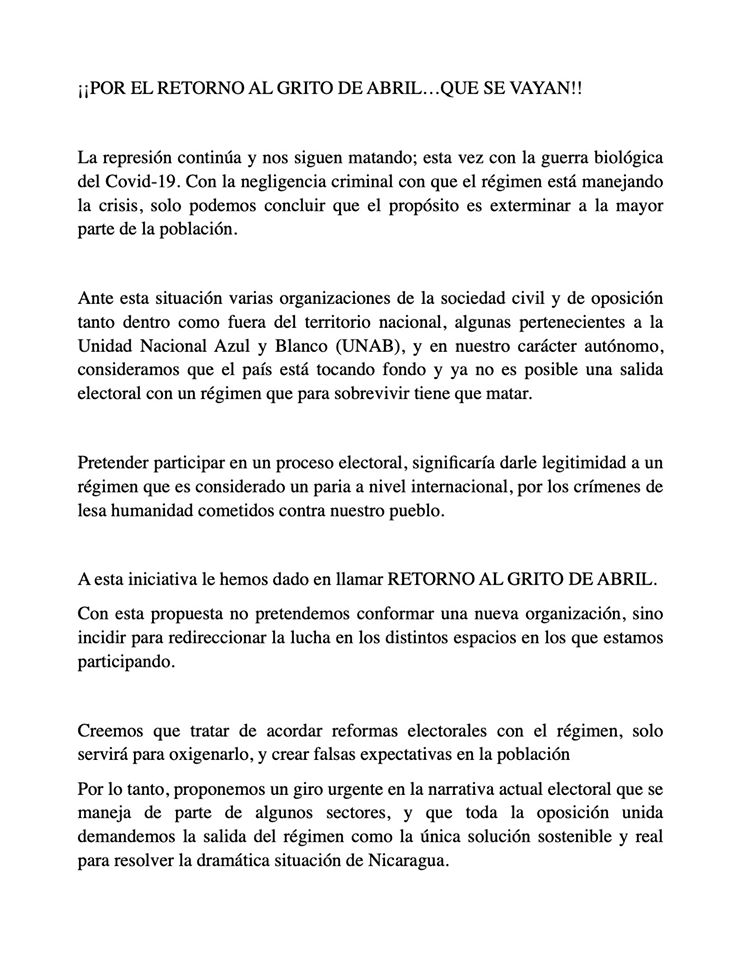 Nos asomamos a la iniciativa "Retorno al Grito de Abril" de los grupos "Nicaragüenses en el mundo", "Azul y Blanco Foundation For Human Rights" y otros más.